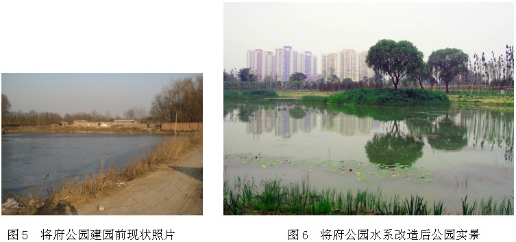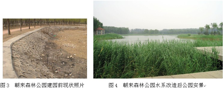在两个公园内都存在现状水系,其中将府公园水系以自然草坡驳岸为主,朝来森林公园的水系则为混凝土堤岸,水系面积较将府公园水系大,虽然两个公园驳岸形式不同,但都存在水岸形态生硬单调,岸线缺少曲折变化,滨水植物单调,缺少层次等问题。为形成良好的水岸效果,并突出公园郊野特色,我们将两个公园的水系改造成为具有人工湿地特色的水系景观。由于两个公园的水系特点不同,我们采取了不同的手法营造水系景观。首先在两个公园内都采用丰富水岸周边林冠线的方式形成错落有致的水岸大背景,其次,由于朝来森林公园现状混凝土堤岸已经形成,所以本着节约建园的原则保留现状堤岸,通过大量芦苇、菖蒲等挺水植物的种植遮挡和柔化驳岸线条,形成柔和、大气的水岸景观(图3、4)。而对于将府公园的水系处理则是采用湿生植物、挺水植物,浮水植物、沉水植物等多种类型植物合理配植的方式形成丰富细腻的水岸景观(图5、6)。对于北京这样缺水的城市将水系设计为湿地景观,多水期可欣赏大水面的开阔宁静,缺水期可观赏水岸植物的艳丽和苍茫,这样无论枯水期还是水量丰沛的时期都会有良好的景观可看,并且能更好的营造出郊野气氛。