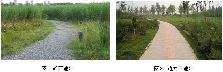 由于北京郊野公园的建设以现有绿地改造为主,所以两个公园内已经具有一定的交通系统,对于园内交通系统的梳理和改造也是一项重要的设计内容。在两个公园内现状一级环园主路都已形成,但路面状况较差;二级园路路网密度不够且破坏现象严重。现有铺装广场面积容量较小且没有采用透水材料。针对以上问题我们对两个公园的道路系统进行了改造,基本保留一级路,并满足车行的要求,形成宽阔平整的主要游园路线,二级园路以林下小路为主,在将府公园和朝来森林公园中我们分别做了不同的材料尝试,在朝来森林公园中采用的是比较常用的透水砖,在将府公园中我们采用了碎石活铺的方法。从建园后的效果来看,碎石活铺的林下小路效果非常好,碎石路与两边的青草形成了非常自然的景观效果并且丰富了人们行走时的节奏和感受,与透水砖相比碎石的成本要节约的多透水性也更好更环保,充分体现了郊野公园的造园要求(图7、8)。