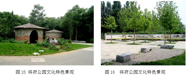 我们在设计郊野公园强调公园郊野感,自然、野趣的同时并不意味着要取消公园间的差异性不要公园特色,整个北京市现阶段预计兴建60个郊野公园,未来随着城市的拓展,第二道自然隔离带的建立还会建设跟多的郊野公园,如果每个公园都是同一种模式都只是一味强调自然、野趣,将会使人们审美疲劳失去吸引力,如何建立公园的差异性,形成自身特色,我们在进行将府和朝来森林公园规划设计时进行了探索。对于将府公园我们深入挖掘了它所在地域的历史文化特色—驼房营的历史背景、西周点将台的传说等等,并在公园主要轴线上设置了几个点来展示。朝来森林公园则是强调了它所在区域的现代文化特色—京城特有的艺术文化圈,利用整个区域的艺术氛围打造森林艺术的理念。从公园建成后的效果来看,通过对公园地域特色的挖掘和展示,两个公园都呈现出了不同的文化特色,增强了地域性,就短期看,公园地域历史特色的展示更能得到人们的关注和接受,在重要的视线焦点处设置文化符号,不但不会削弱公园的郊野气氛增加建园负担,相反使公园更具特色更能够吸引游人提高公园和场地的利用率,也为公园远期建设打好基础(图15、16)。