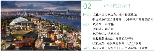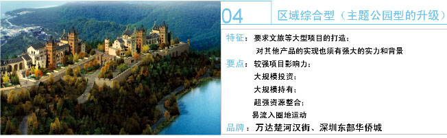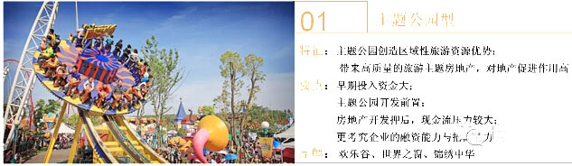 “主题公园型”,旅游特色明显,对开发商的资金力要求较高,其中主题公园的打造是关键;
